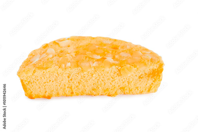 A soft and tender orange cake on white background.