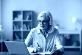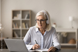 Middle-aged female wears wireless headphones make notes, writes test while listening course, take part in educational seminar or webinar through website or professional application. Study, modern tech