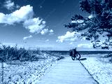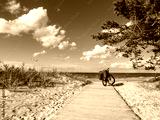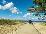 A touring bicycle stands on a wooden path along the Baltic Sea coast.