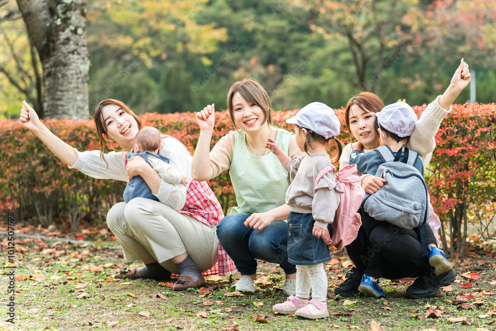 秋の公園を散歩・遠足する保育士の女性と園児(保育園・幼稚園保母・子供・幼児)