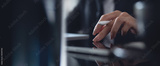 Close up of business woman using digital tablet surfing the internet, finger touching on blank screen and working on laptop computer at modern office, searching the information