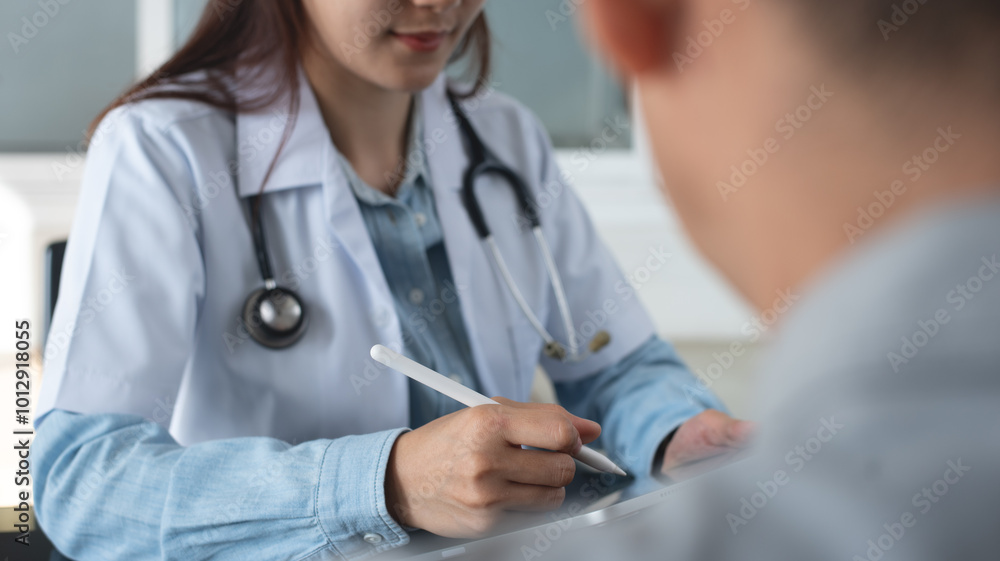 Female asian doctor using digital tablet, writng prescription for her patient, medical screening, medical examination at medical clinic, close up