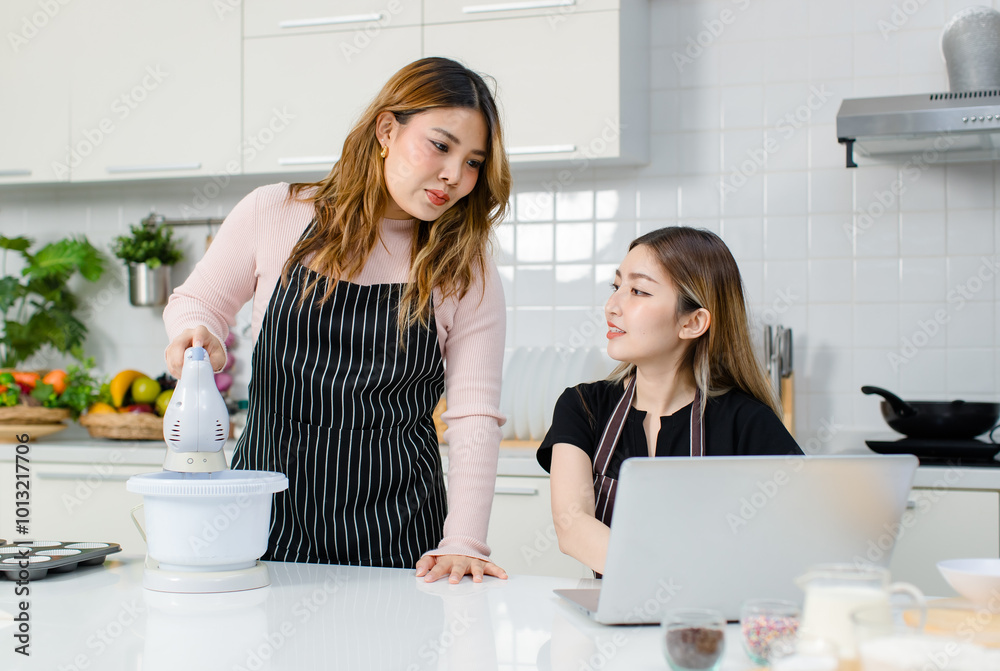 Two happy young Asian female friends, woman wearing aprons, cooking dough baking cakes, dessert, looking online recipe guidebook on laptop computer enjoy weekends in kitchen, teenage lifestyle at home