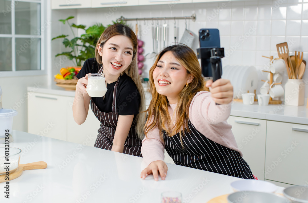 Two happy young beautiful Asian female, woman wearing aprons using mobile phone streaming live video clip or taking selfie photo smiling while making bakery in kitchen enjoy teenage lifestyle at home.