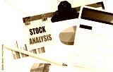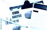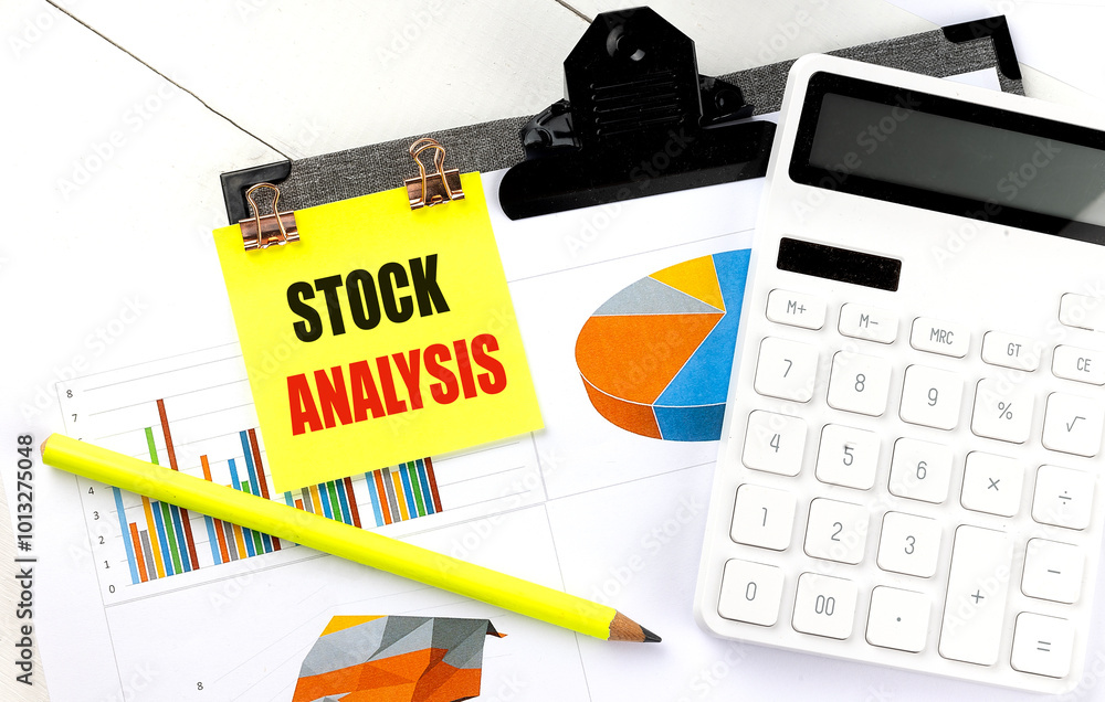 Stock analysis concept with calculator, financial charts, and pencil in an office setting
