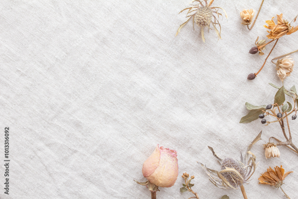 Decorative frame and copy space for dried flowers of pale pink roses and orange blossoms