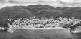 Aerial view of Petrovac, Montenegro, showcasing its stunning coastline, blue waters, and charming architecture under a sunny sky.