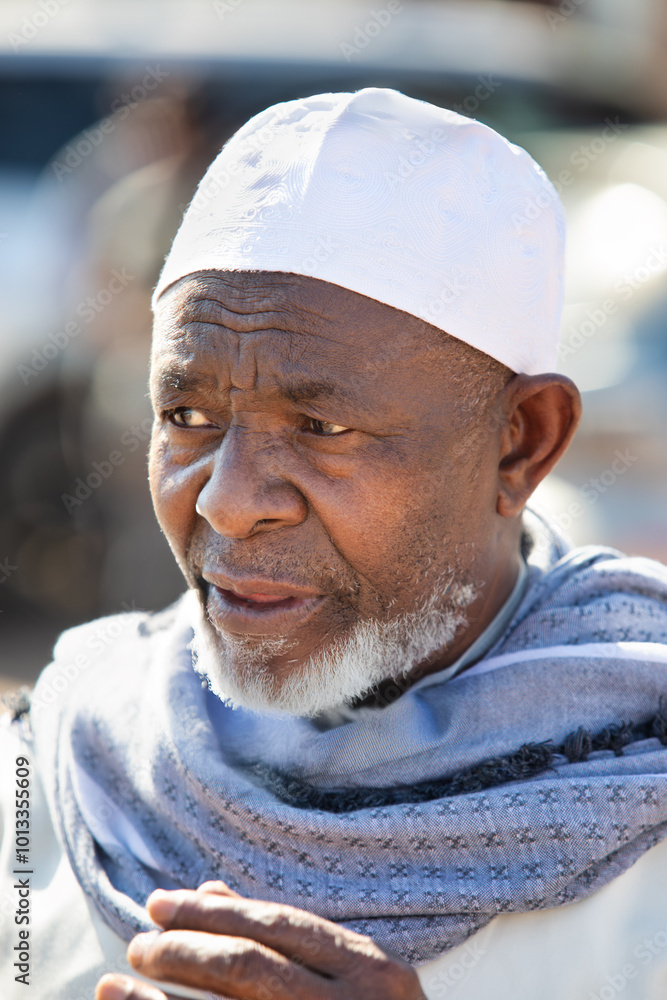 portrait of old african muslim man with taqiyah kufi prayer cap, Islam men outdoors on the street