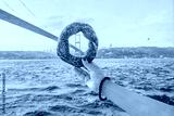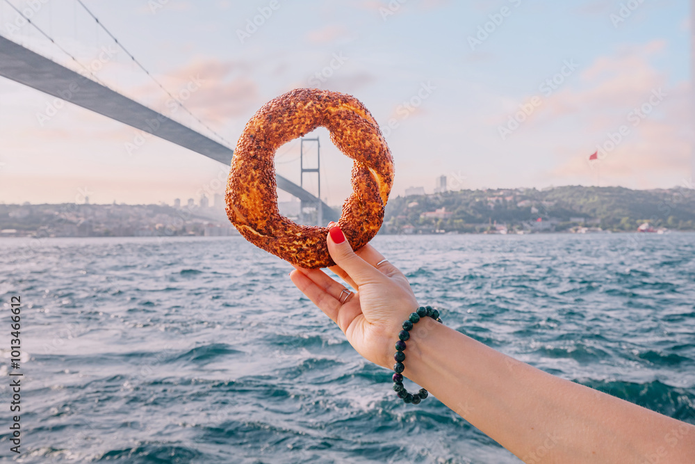 A delicious simit in hand, a traveler explores the Bosporus strait in Istanbul, embracing the city's rich food culture during her holiday