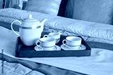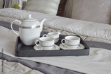elegant tea cup set on black tray in modern bedroom interior