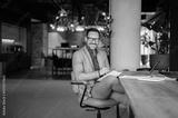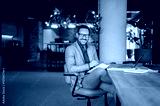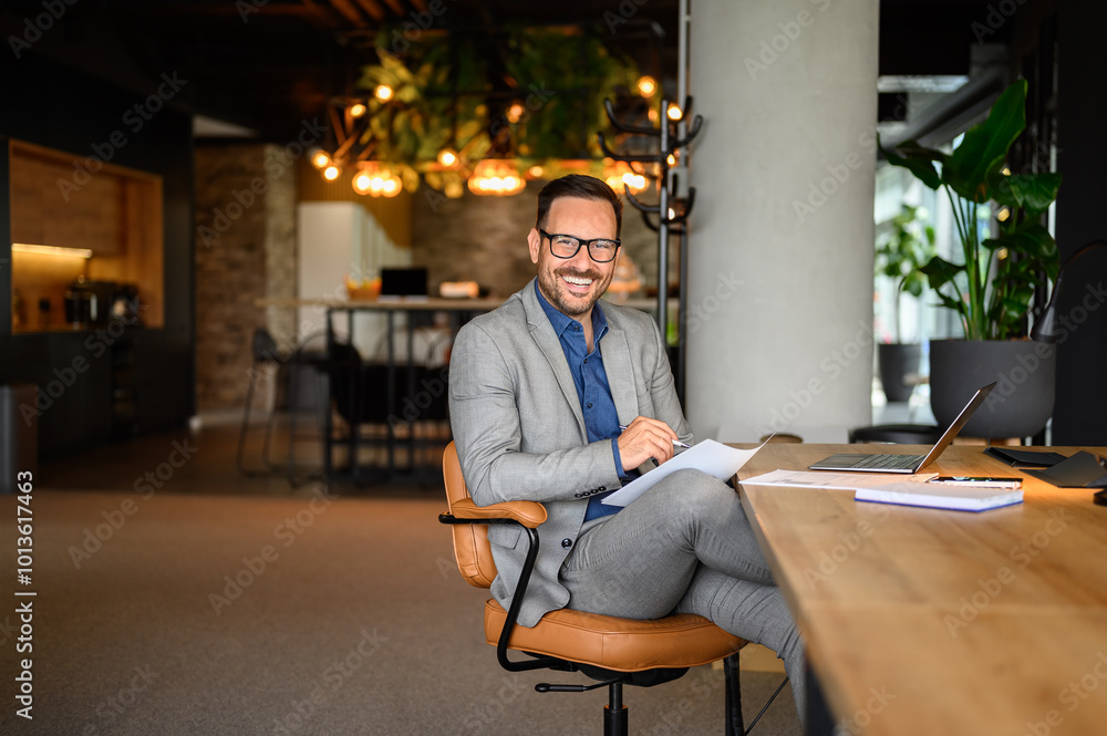 Positive young businessman in eyeglasses smiling at camera and working over laptop at desk in office