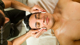 Male beautician is giving a facial treatment to a man lying on a massage table in a spa