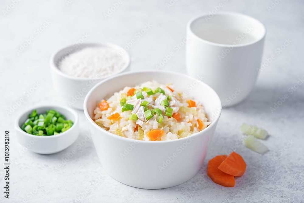 Asian rice chicken soup with carrots and celery in a bowl