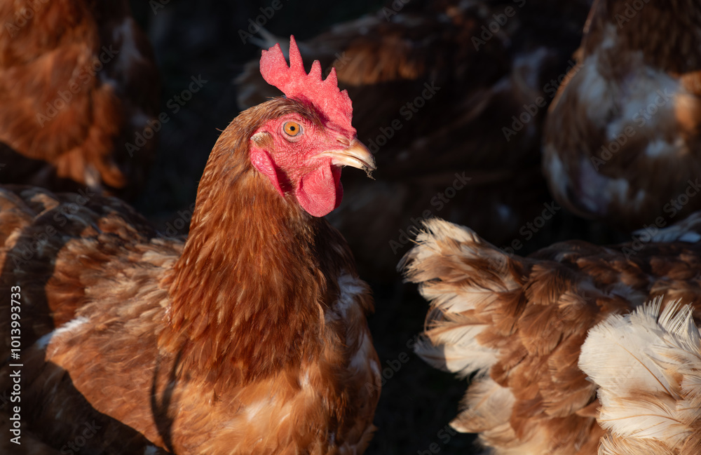 Close-up of a brown chicken standing among other chickens and raising its head.