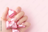 Womans hand with trendy pink matte manicure holding candy close-up