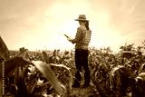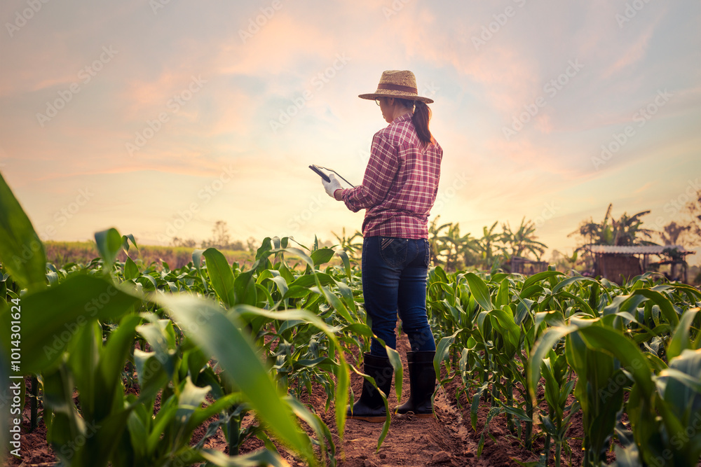 Young farmer woman using digital tablet computer inspects growing corn standing in young cornfield at sunset or sunrise