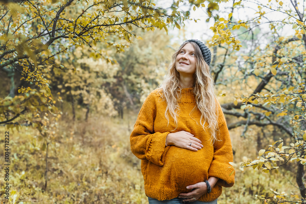 Caucasian happy mature pregnant woman walking in autumn park