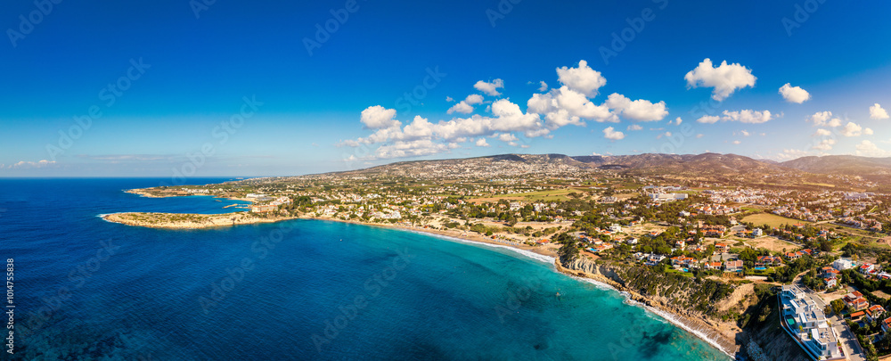 Aerial panoramic view of Coral bay beach, Cyprus. Overhead view of Coral Bay beach, Peyia village, Paphos district, Cyprus. Aerial view of Coral Bay beach in Peyia village, Cyprus.