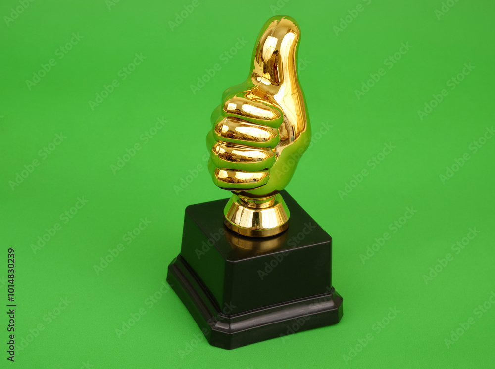 Gold thumbs up cup on green background. Room for text.