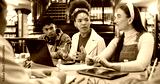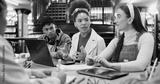 Education, laptop and discussion of group, library and preparation for exam, talking and studying. College students, friends and people with tech, ideas and notebook for learning, digital and smile
