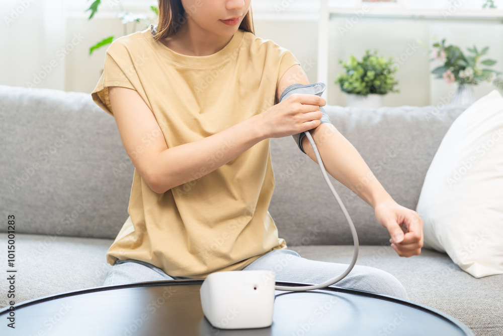 Hypotension problem asian young woman sitting on couch checking high blood pressure and heart rate with digital pressure monitor, making self check up pulse on arm, cuff at home. Healthcare medical.