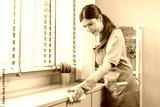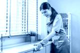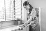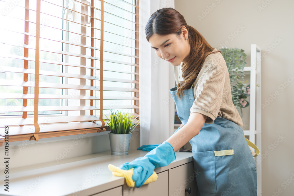 Cleanliness household asian young woman working chore cleaning on cupboard at home, hand wearing glove and using wiping with microfiber cloth remove dust in living room. Hygiene tool for cleaning up
