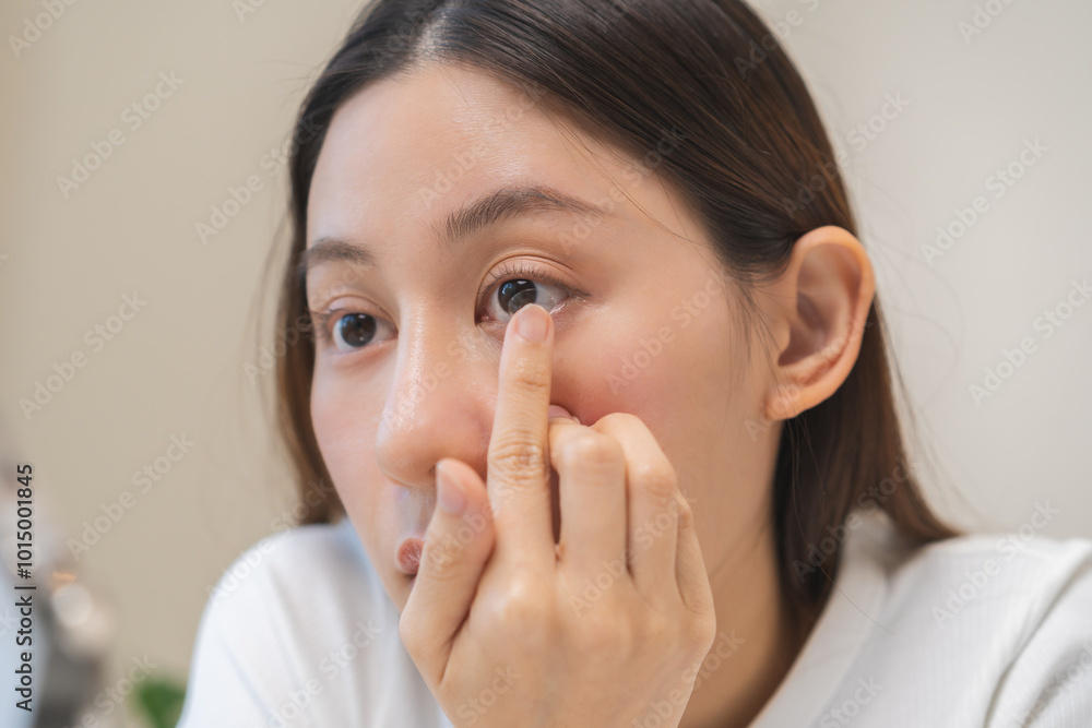 Ophthalmology care, eye sight, vision concept. Asian young woman, female hand holding and putting, wearing soft contact lenses with finger on face, girl looking in mirror at home, beauty and health.
