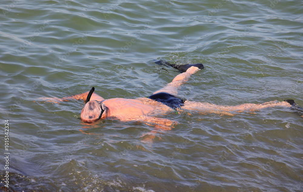 man with a diving mask snorkel swimming while looking at the ocean floor