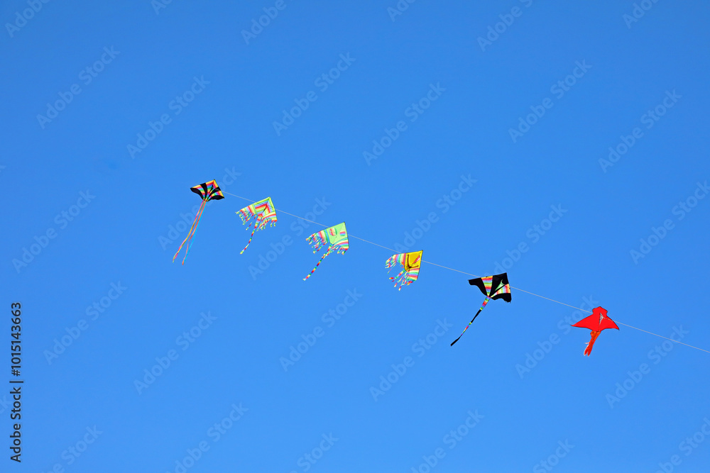 colorful kites are flying high in the blue sky, tied together as they float in the air with a feeling of freedom