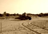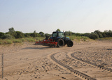 tractor with large rake attached to the rear for morning beach maintenance and cleaning