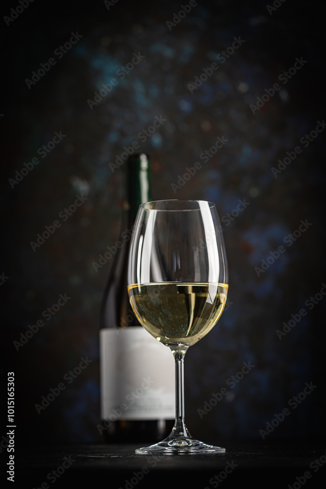 A dark, elegant still life of white wine in a glass with wooden background. Perfect for wine-themed compositions