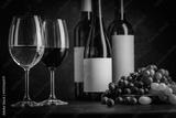 A dark, elegant still life of White and Red wine in a glass with wine bottles and fresh grapes in the background. Perfect for wine-themed compositions