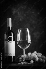 A dark, elegant still life of white wine in a glass with wine bottles and fresh grapes in the background. Perfect for wine-themed compositions