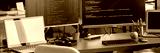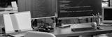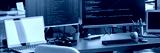 Website header shot of programmer desk setup with laptop and multiple computer screens displaying source code programming at office workplace