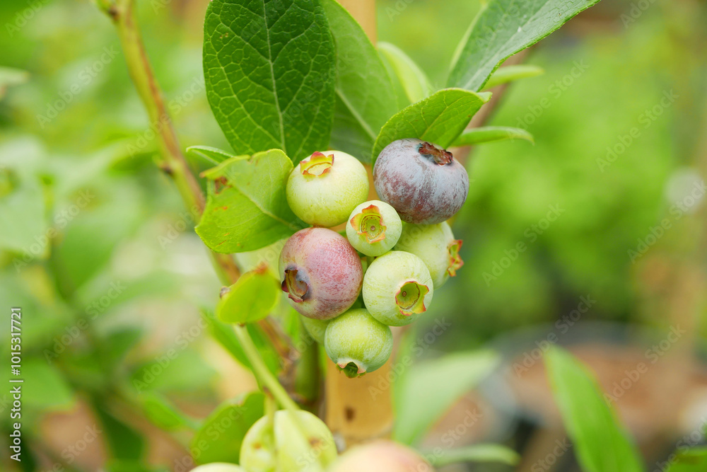 Vaccinium corymbosum blueberry northern highbush close-up North American plant fruit bush species blue huckleberry detail, blue ripe fruits, growing in a pot in the garden farm Europe