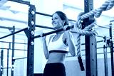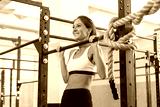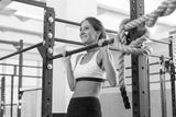 Fitness woman pull ups on horizontal bar in gym.