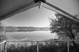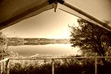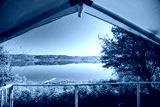 Camping in a cozy bell tent overlooking a quiet lake in the wild.