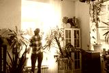 Woman manually washes the window of the house with rag cleaner and mop inside the interior with white curtains and home plants. Restoring order and cleanliness in the spring, cleaning servise