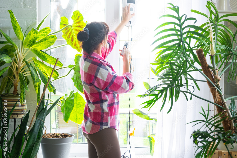 A woman launches a window cleaner robot of the house inside the interior with home plants. Household robotics, household assistant, cleaning servise
