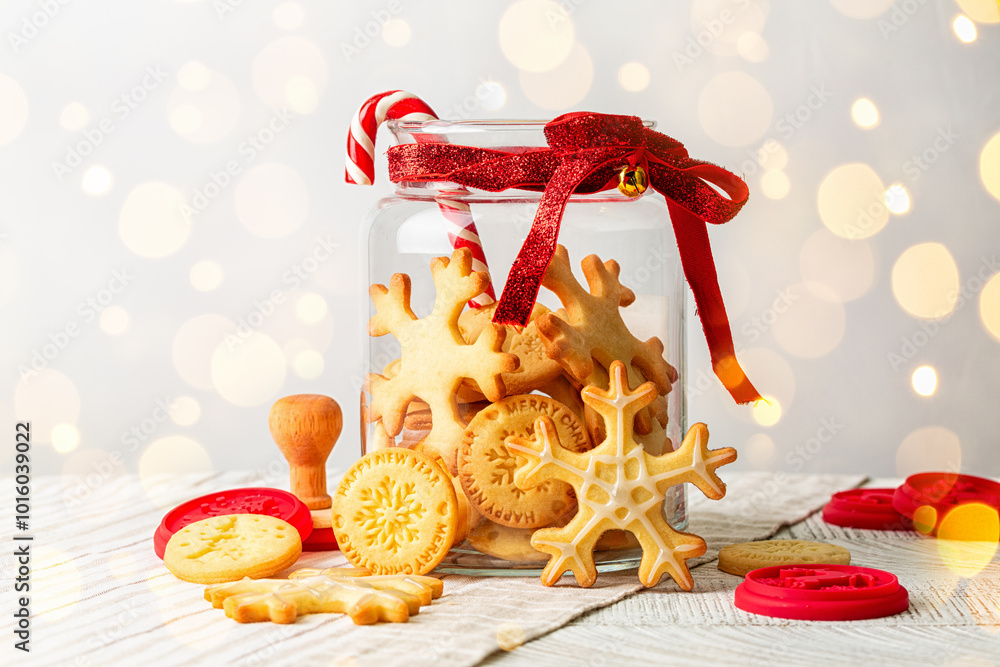 Homemade snowflake shaped and round shaped cookies with text Happy New Year and Merry Christmas, glass jar with red ribbon, white background with light.
