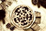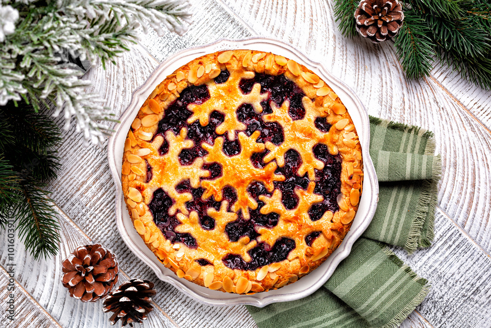 Baked mixed berry crust pie or tart with snawflakes decoration. Homemade. Winter Christmas or New Year festive bakery, wooden white table surface, top view.