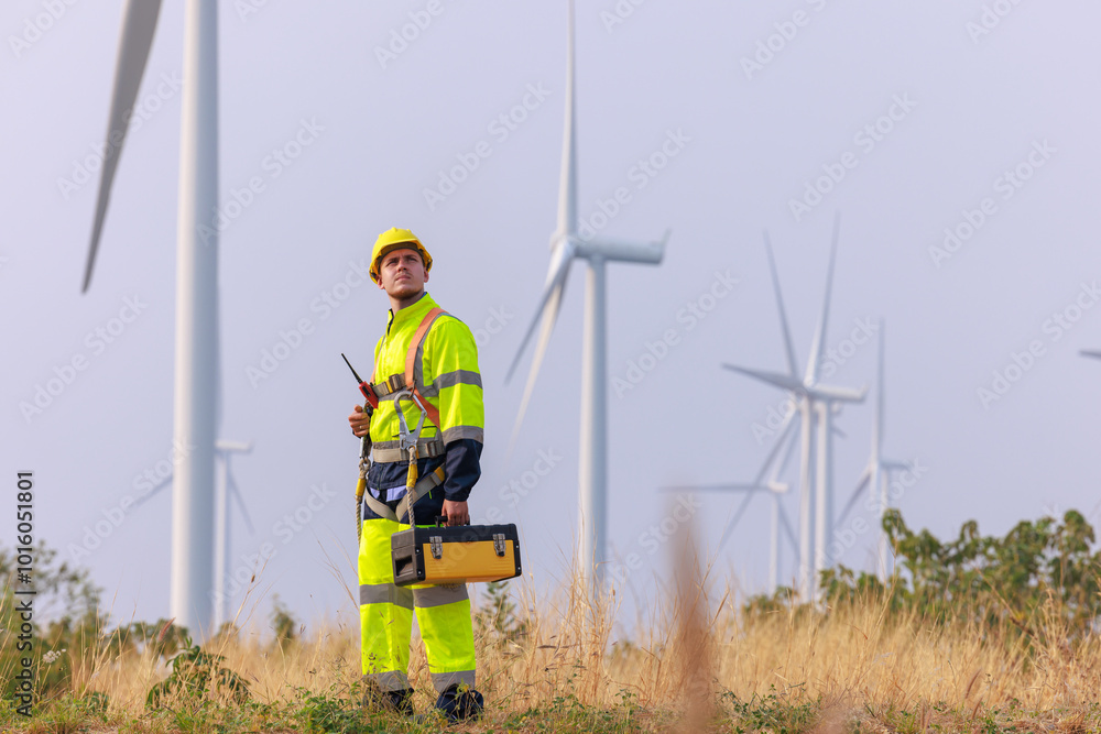 engineers wearing uniform and hardhats standing at wind turbines farm.