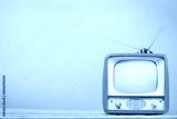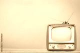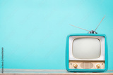 Retro CRT TV with antenna on old table front gradient mint blue background. Vintage style filtered photo