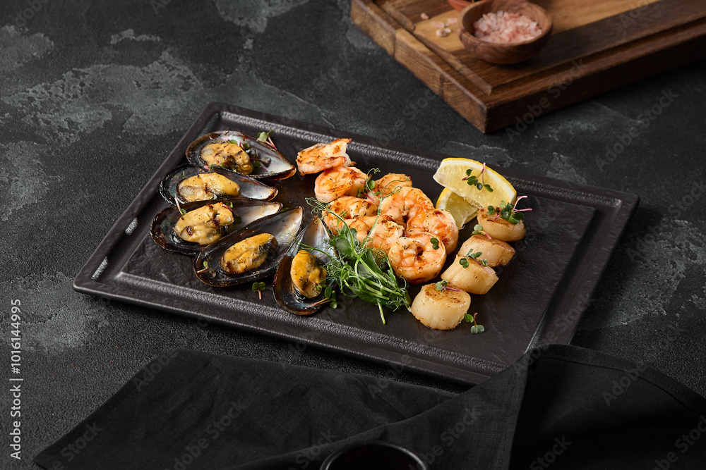 Gourmet Seafood Medley on Dark Stone Plate with Vibrant Colors and Elegant Composition