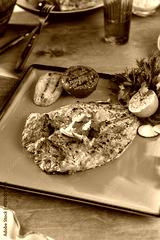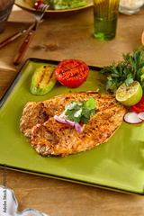 Grilled Fish Fillet with Grilled Vegetables and Cilantro Garnish on a Green Plate