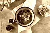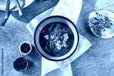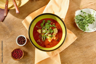 Vibrant Food Composition with Hearty Soup in Green Bowl Featuring Fresh Herb Garnish and Minimalist Table Setting