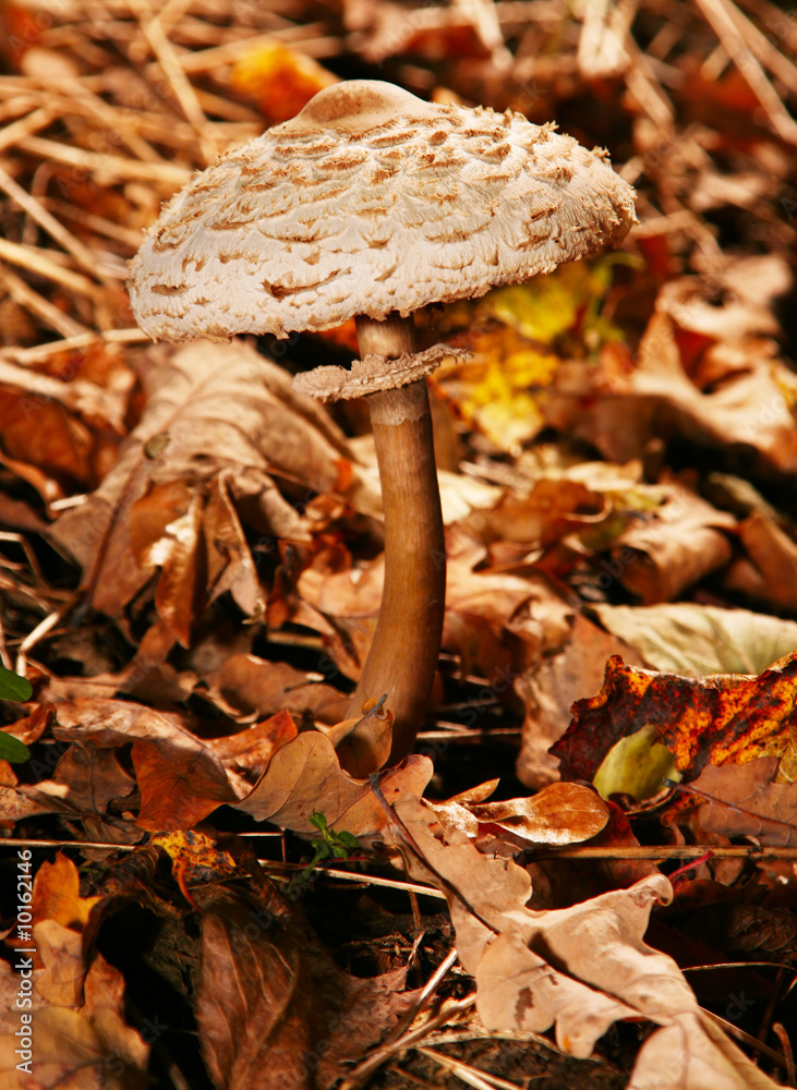 Mushroom detail view in forest with leaf