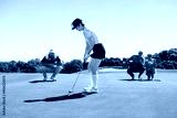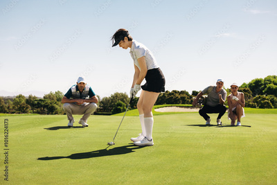 Woman in putting stance aiming carefully with players watching