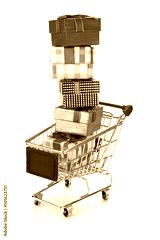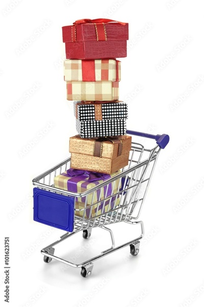 Shopping Cart With Stack Of Gift Boxes Isolated On White