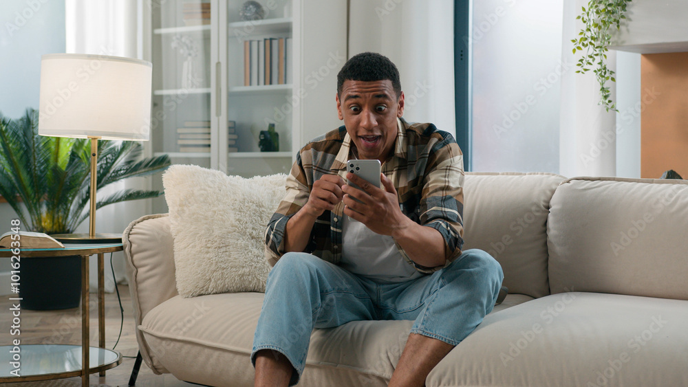 Surprised excited African American shocked man winner win smartphone achieve read good internet news amazed by mobile phone achievement winning victory success online bet bid game happy guy at home